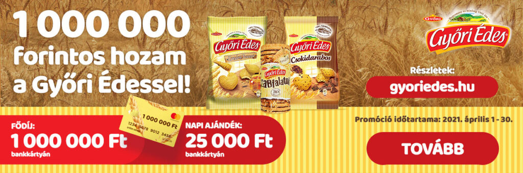 Vásárolj bármilyen Győri Édes terméket, őrizd meg a vásárláskor kapott blokkot, és töltsd fel az adatait a www.gyoriedes.hu oldalon! Már egyszeri vásárlással is megnyerheted a napi 25 000 forint egyikét, vagy akár fődíjként az 1 000 000 forintot bankkártyán!