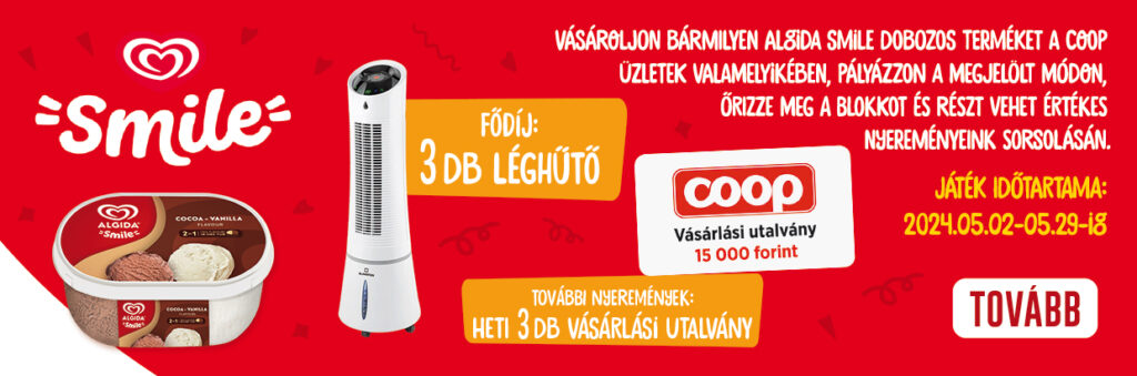 Vásároljon bármilyen Algida Smile dobozos terméket a Coop üzletek valamelyikében, pályázzon a megjelölt módon, őrizze meg a blokkot és részt vehet értékes nyereményeink sorsolásán.