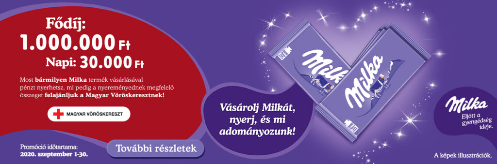 Vásárolj bármilyen Milka csokoládé vagy Milka keksz terméket, töltsd fel a vásárlást igazoló blokk adatait a játék oldalán, és nyerj naponta 30 000 Ft-ot, vagy vidd haza az 1 000 000 Ft-os fődíjat! A Milka a nyereményeddel azonos összeget felajánlja a Magyar Vöröskereszt számára.