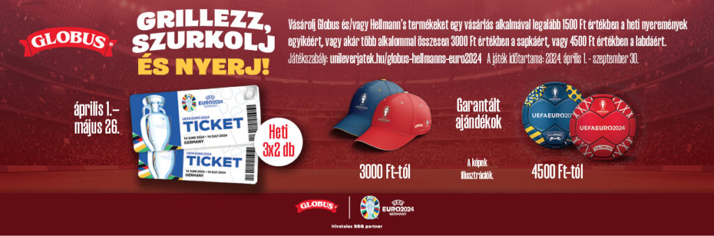 Vásárolj Globus és/vagy Hellmann’s termékeket egy vásárlás alkalmával legalább 1500 Ft értékben a heti nyeremények egyikéért, vagy akár több alkalommal összesen 3000 Ft értékben a sapkáért, vagy 4500 Ft értékben a labdáért. Játékszabály: www.unileverjatek.hu/globus-hellmanns-euro2024