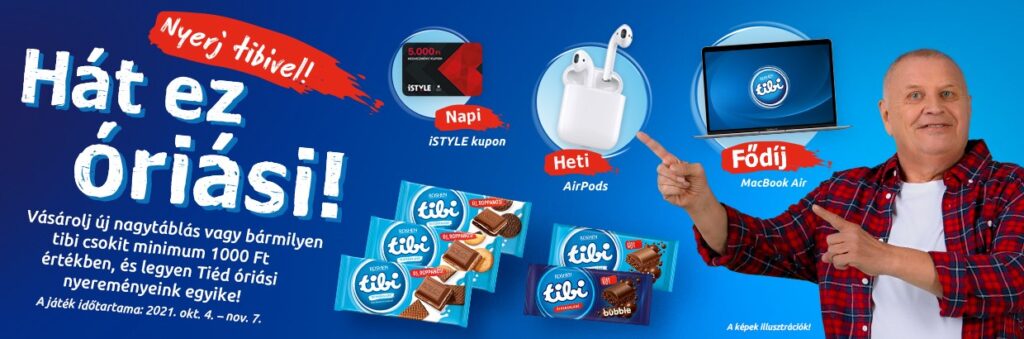 Vásárolj 2021. október 4. és november 7. között kistáblás vagy új nagytáblás tibi csokoládékat, tibi szaloncukrokat vagy tibi mikulás termékeket összesen legalább 1000 Ft értékben, és legyen a tiéd óriási nyereményeink egyike!