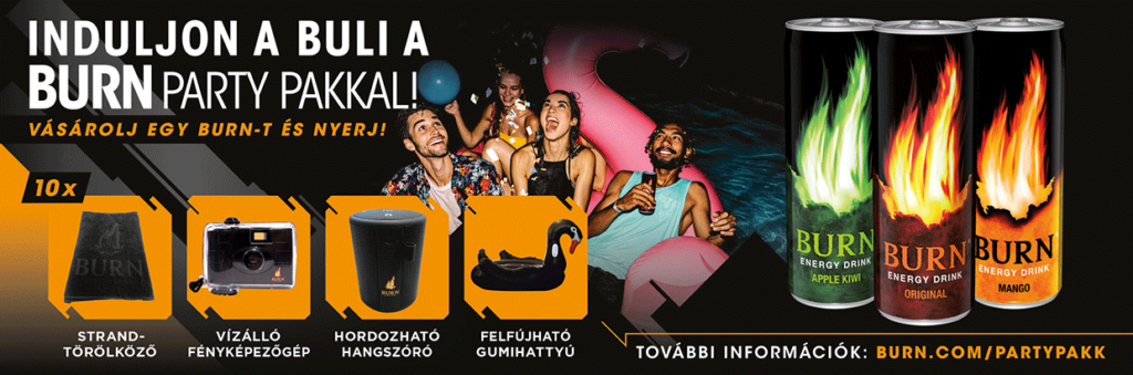 Vásárolj egy BURN energiaitalt bármilyen ízesítésben, és a blokk segítségével regisztrálj a burn.com/partypakk weboldalon a 10 party csomag egyikéért! A csomagok tartalma egyenként: 1 db strandtörölköző, 1 db vízálló fényképezőgép, 1 db hordozható hangszóró és 1 db felfújható gumihattyú. 2020. augusztus 28-ig van lehetőséged játszani! Ne maradj le!