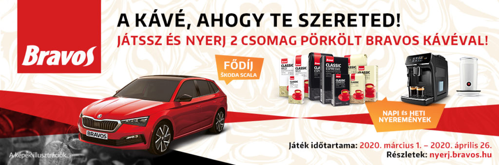Vásárolj legalább 2 csomaggal bármely Bravos pörkölt kávéból, tartsd meg a vásárlást igazoló blokkot, majd a blokkon található AP-kódot töltsd fel a nyerj.bravos.hu oldalra. A játékosok között kisorsolunk napi nyereményként egy Bravos kávécsomagot, heti nyereményként 8 db automata kávéfőzőt és 16 db tejhabosítót, illetve egy db ŠKODA SCALA-t!