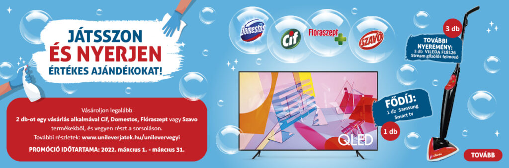 Vásároljon a Coop üzletlánc üzleteiben egy alkalommal minimum 2 db-ot a Cif, Domestos, Flóraszept vagy Szavo termékekből, és az Öné lehet a 3 db Vileda F18126 Jet Steam gőzölős felmosó egyike, vagy a fődíj: 1 db Samsung QLED Smart televízió!