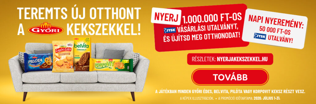 Vásárolj bármilyen Győri keksz terméket, őrizd meg a vásárláskor kapott blokkot/számlát, és töltsd fel az adatait a www.nyerjakekszekkel.hu oldalon! Már egyszeri vásárlással is megnyerheted a napi nyereményt vagy akár a fődíjat is.