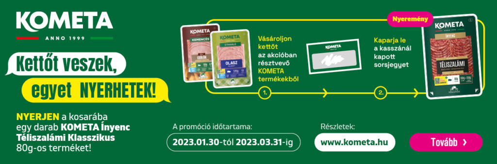 Vásárolj egyszerre legalább kettőt az akcióban részt vevő KOMETA-termékekből a Coop abc, szuper vagy szuper plusz üzletekben 2023. január 30. és 2023. március 31. között! Fizetést követően kérd a pénztárostól a sorsjegyet és kapard le, hogy kiderüljön, megnyerted-e azonnali ajándékodat: egy KOMETA Ínyenc Téliszalámi klasszikus 80 g-os terméket.