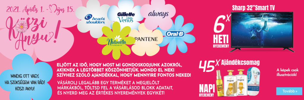 Vásárolj legalább egy terméket a Naturella, Gillette Venus, Pantene, Always, Oral B vagy Head&Shoulders márkákból, töltsd fel a vásárlásod blokkadatait a koszianyu.net oldalra, és nyerd meg az értékes nyeremények egyikét!