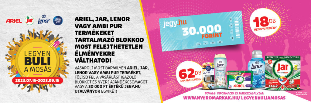 Teendőid: 1. Vásárolj a megadott üzletekben Ariel, Lenor, Jar vagy Ambi Pur terméket! 2. Regisztrálj a weboldalon, töltsd fel a blokkod adatait! 3. Őrizd meg a blokkot a nyereményed átvételéhez! 4. Örülj, ha nyertes értesítő emailt kaptál! 😊 5. Használd egészséggel a csomagot, vagy váltsd be az utalványt kedvenc bulidra!