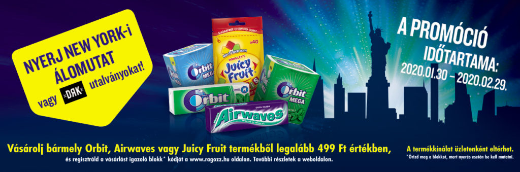 Minden vágyad, hogy láthasd azt a várost, ahol a legkirályabb filmeket forgatják, megnézz egy előadást a Broadway-n, sétálj a Times Square forgatagában vagy piknikezz a Central Parkban? Itt a lehetőség, hogy a kedvenc rágód elrepítsen a tengeren túlra! Vásárolj legalább 499 forint értékben Orbit, Airwaves vagy Juicy Fruit terméket, és játssz a két főre szóló 5 napos new york-i utazásért és más értékes nyereményekért!