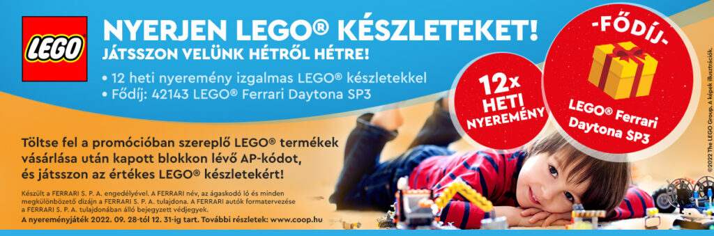 Vásároljon a promóció ideje alatt minimum 1 darab, bármely promo+ emblémával ellátott Coop abc, szuper és szuper plusz üzlet kínálatában szereplő LEGO® terméket, regisztrálja blokkját és induljon heti nyereményekért, valamint exkluzív fődíjunkért!