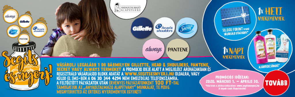 Nem kell mást tenned, mint 2020. március 1. és április 30. között bármilyen Gillette, Head&Shoulders, Pantene, Secret vagy Always terméket vásárolni a Coopnál, és regisztrálni blokkod adatait. Ezt a www.segitsesnyerj.hu oldalon, vagy a sms-ben teheted meg. Minden feltöltött érvényes pályázat után 100 Ft-tal támogatjuk az Anyaoltalmazó Alapítvány munkáját, Te pedig a heti sorsoláson 50 000 Ft-os vásárlási utalványt, és a napi sorsoláson ajándékcsomagot nyerhetsz!