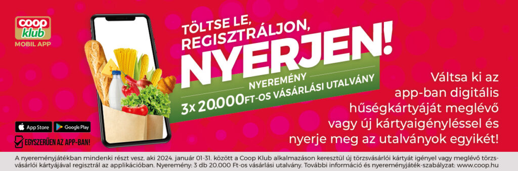 A nyereményjátékban mindenki részt vesz, aki 2024. január 01-31. között a Coop Klub alkalmazáson keresztül új törzsvásárlói kártyát igényel vagy meglévő törzsvásárlói kártyával regisztrál az applikációban.