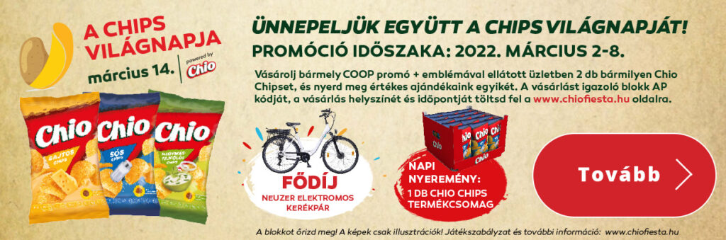Vásárolj bármelyik Coop promo+ emblémával ellátott üzletben 2 db tetszőleges Chio Chipset, és nyerd meg értékes ajándékaink egyikét! A vásárlást igazoló blokk AP-kódját, a vásárlás helyszínét és időpontját töltsd fel a www.chiofiesta.hu oldalra!