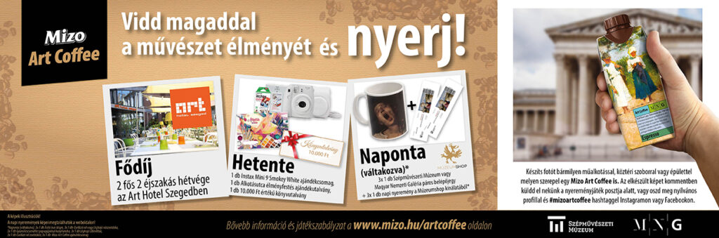 Napi nyeremények a Múzeum Shop kínálatából: 3×1 db Szépművészeti Múzeum vagy Magyar Nemzeti Galéria páros belépőjegy és 3×1 db napi nyeremény váltakozva: – Ásító inas bögre – Csellózó nő vászontáska – Léghajó vászontáska – Gyümölcscsendélet papagájokkal konyharuha – Léghajó útlevéltok – Csellózó nő zsebtükör – Mizo Art Coffee ajándékcsomag Heti nyeremények: – 1 db Instax Mini 9 Smokey White ajándékcsomag – 1 db Alkotásutca élményfestő ajándékutalvány – 1 db 10.000 Ft értékű könyvutalvány Fődíj: 2 fős 2 éjszakás hétvége az Accent Hotels által üzemeltetett Art Hotel Szegedben